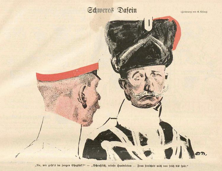 Eduard Thöny lieferte für die satirische Zeitschrift „Simplicissimus“ von deren Gründung 1896 bis zur Einstellung 1944 fast wöchentlich Beiträge in Form von Zeichnungen und deckte dabei vorrangig den Bereich Militär- und Gesellschaftskritik ab.