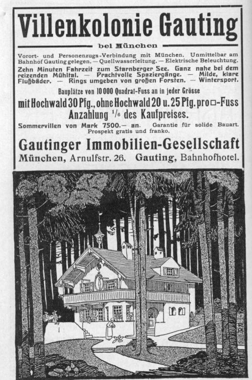 Gautinger Immobilien-Gesellschaft, Anzeige „Villenkolonie Gauting“, in: Offizieller Katalog der Münchener Jahresausstellung 1910 im kgl. Glaspalast, S. 8