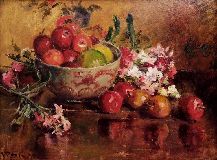 Ludwig Bock, Stillleben mit Äpfeln und Blumen, o. J., Öl auf Leinwand, Privatbesitz