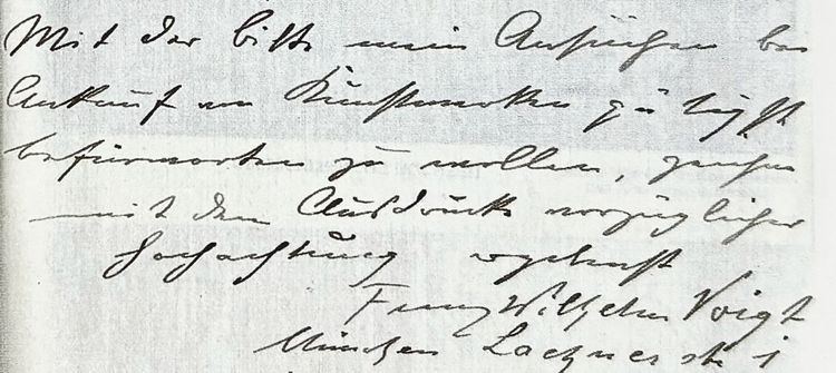 Text: Regina M. FischerLITERATURFischer, Regina: „Anfrage“, E-Mail an Dr. Karin Althaus, 10. Oktober 2025.Galerie Heinemann online, Datenbank zum Kunsthandel der Münchner Galerie Heinemann (1872-1938), URL: https://heinemann.gnm.de/de/willkommen.html, [zuletzt abgerufen am 15.11.2025]Mey, Ellen: Der Maler Franz Wilhelm Voigt und die Künstlervereinigung „Scholle“, 69. Bericht des Nordoberfänkischen Vereins für Natur-, Geschichts- und Landeskunde, Hof 2017, S. 21, 22, 29.