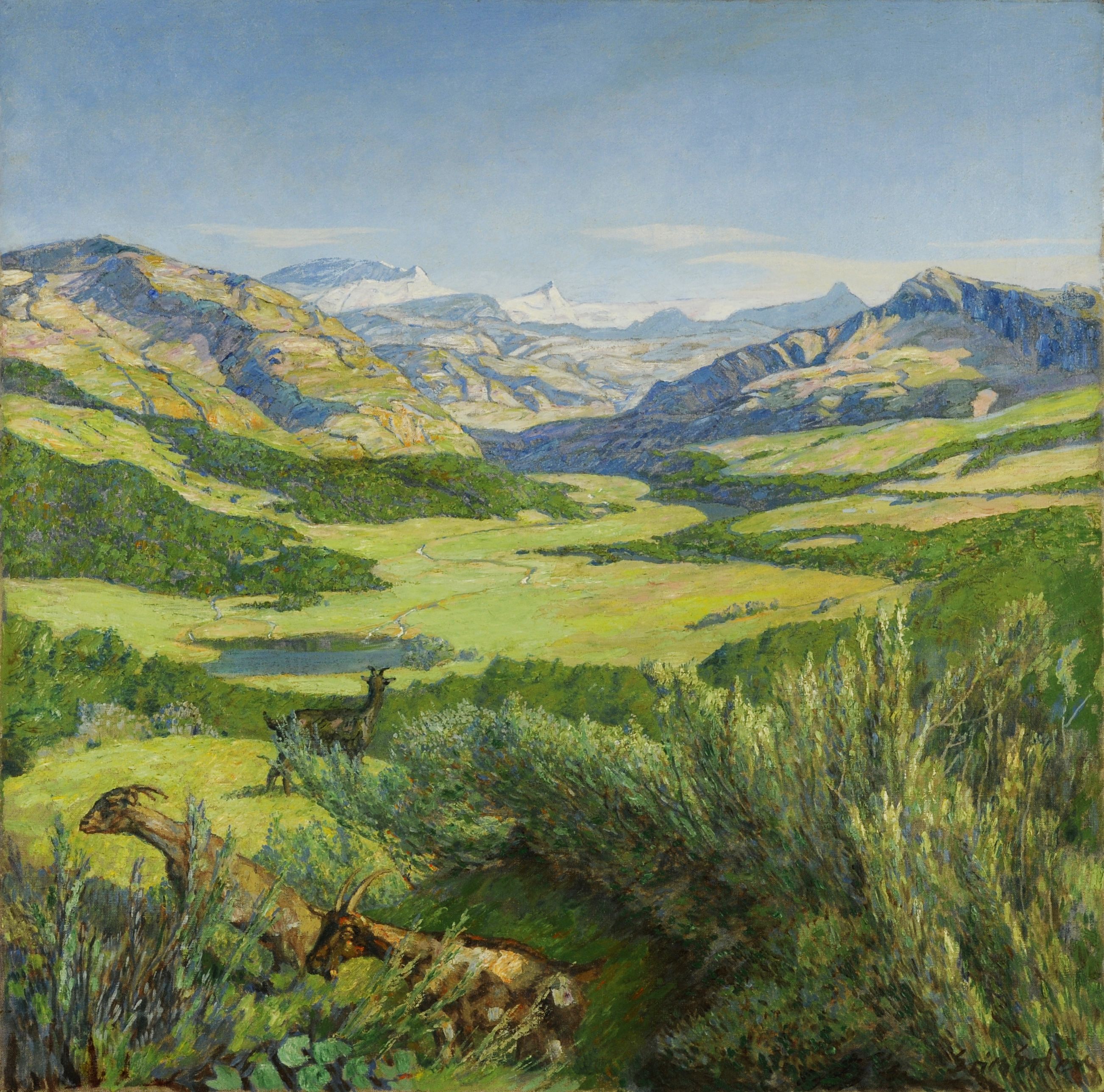 Berglandschaften und das Leben der Gebirgsbewohner wurden zu seinen Motiven, mit denen er sich einen Namen machte. Zahlreiche dieser Sujets hat Erich Erler über viele Jahre hinweg mit geringen Variationen wiederholt.Erler gliedert seine Landschaft in drei Zonen. Im Vordergrund grasen drei Ziegen zwischen den Sträuchern, vom erhöhten Betrachterstandpunkt aus fällt der Blick weit ins Land auf das liebliche sonnenbeschienene Tal, das im Hintergrund durch eine Bergkette begrenzt wird. Die Farbigkeit ist im Wesentlichen auf eine Reihe von Grünvaleurs und das Blau der verschatteten Gebirgsregionen begrenzt. Die aufgelöste Malweise erinnert durchaus noch an den Divisionismus Giovanni Segantinis (1858-1899), der ebenfalls mit feinen Pinselstrichen und reiner Farbe seine Berglandschaften aufbaute.
