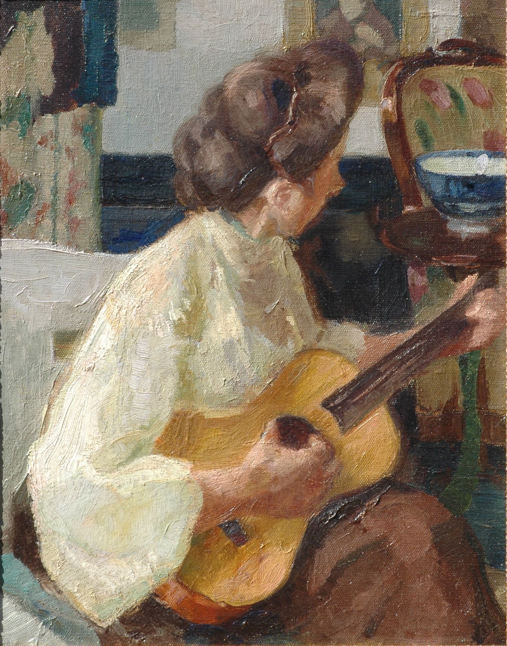 Adolf Höfer, Die Gitarrenspielerin, o. J., Öl auf Leinwand, 48,5 x 38,5 cm, PrivatbesitzIn diesem Gemälde verknüpft Höfer Figurenbild und Interieur miteinander. Eine junge Frau sitzt im Vordergrund unmittelbar an der Bildkante und damit ganz nahe am Betrachter.Sie trägt eine helle, hochgeschlossene Bluse mit Ballonärmeln und einen braunen Rock. Ihr dunkles Haar ist in weichen Wellen hochgesteckt.Auf den Knien hält sie eine Gitarre. Deutlich ist zu sehen, wie sie mit der Linken am Hals des Instruments die Saiten greift und mit der rechten Hand zupft. Ihr Blick folgt den Gitarrengriffen und ist somit vom Betrachter abgewandt. Höfer zeigt sie in einem Moment konzentrierten Spiels.Bei der Dargestellten könnte es sich um Nadine von Enckevort (1891-1973) handeln, von der in Skizzenbüchern Studien erhalten sind. Die aus Pommern stammende Tochter aus adeliger Familie war seit März 1909 Schülerin an der Damenakademie des Münchner Künstlerinnenvereins. Dort war sie auch Schülerin von Adolf Höfer. Die Verlobung der beiden wurde, wohl auf Grund des Standesunterschieds, wieder gelöst.Hinter der Musikerin fällt der Blick des Betrachters auf den Wohnraum mit seiner bürgerlichen Ausstattung. Ein gemusterter Vorhang in der linken oberen Ecke und die Stuhllehne und der runde Tisch, auf dem sich eine blaue Schale befindet, am rechten Rand rahmen die Szenerie. Dazwischen hängen, zum Teil von anderen Bildgegenständen überdeckt, drei Gemälde nebeneinander an der Wand. Das mittlere ist als Porträt zu erkennen.Höfer gibt damit eine Reihe von Details wieder und deutet die Raumerstreckung zumindest an.Zwei Diagonalen bilden die Hauptkompositionslinien. Eine Diagonale führt von der linken unteren Bildecke über die rechte Hand, die die Gitarrensaiten zupft, also den Klang erzeugt, über den Gitarrenhals die Saiten entlang und endet etwas oberhalb der Bildmitte. Eine zweite Diagonale verläuft am rechten Arm, der Schulter entlang über den Hinterkopf zu einem Bildnis an der Wand des Raumes. Der Blick des Betrachters folgt der Musikantin und ist auf sie und ihr Spiel fokussiert. Insgesamt schafft Höfer, auch dank der geschlossenen Komposition, eine warme, anheimelnde Atmosphäre von anrührender Intimität.Text: Regina M. FischerTeilen