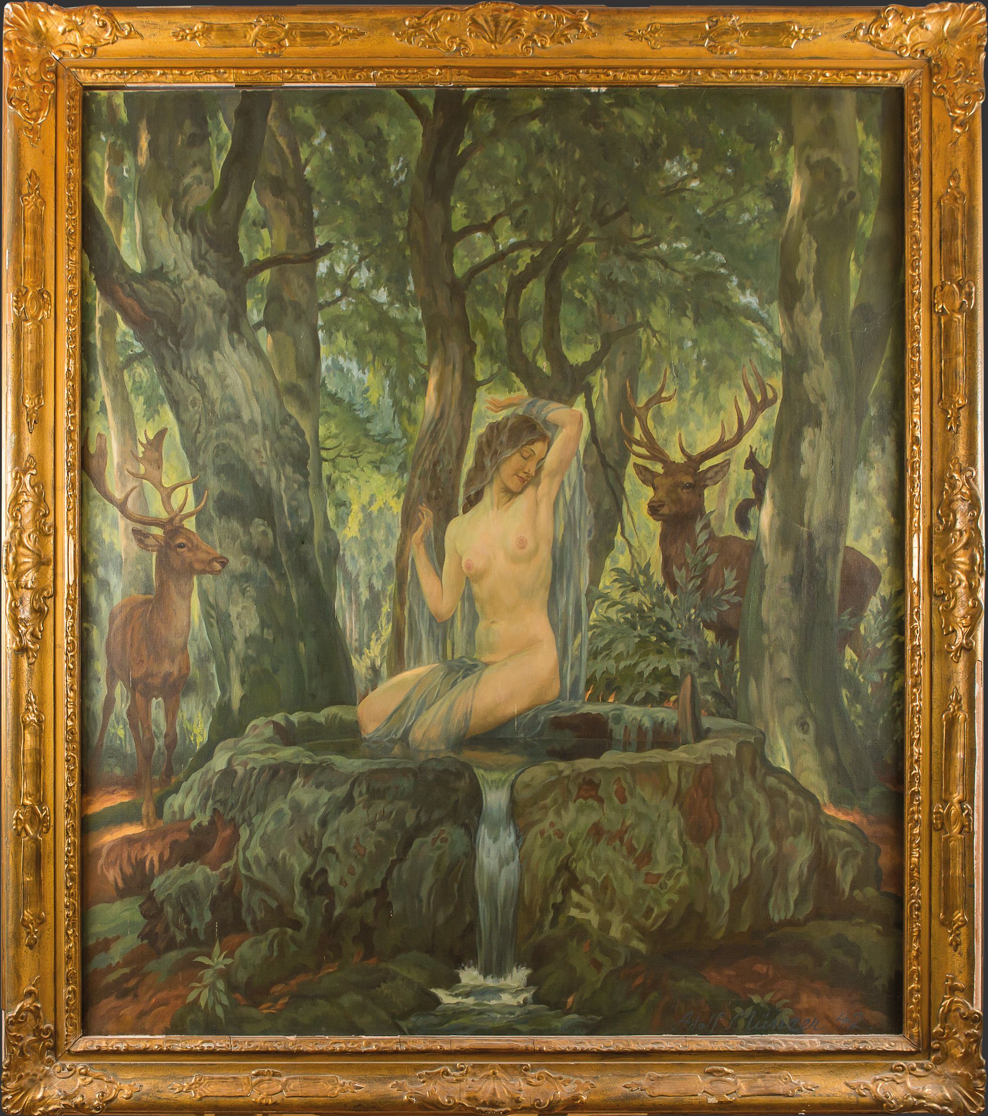 Adolf Münzer, Waldquelle oder Genoveva, 1942, Öl auf Leinwand, 170 x 150 cm, Privatbesitz Zweimal setzte sich Adolf Münzer künstlerisch mit der Genoveva Legende auseinander. Die Sage handelt von einer Königstochter, die, als ihr Gatte, ein Adeliger namens Siegfried, auf einem Feldzug war, von dessen Stellvertreter zu Unrecht des Ehebruchs bezichtigt wurde, weil sie ihn abgewiesen hatte. Der Henker, der das Todesurteil an ihr vollstrecken sollte, brachte sie stattdessen in den tiefen Wald und überließ sie ihrem Schicksal. Eine erste Version aus dem Jahr 1932, die Mutter und Kind zwischen Bäumen sitzend und von Rotwild umringt darstellt, ist verschollen.Das Bildthema, das häufig unter dem Titel „Genoveva in der Waldeinsamkeit“ auftritt, hat Münzer in der zehn Jahre später entstandenen zweiten Version insofern abgewandelt, als er Genoveva nicht mit ihrem Sohn darstellt, sondern sie in der Bildmitte als Akt in den Mittelpunkt einer Landschaftsdarstellung zeigt. Verführerisch als Dreiviertelfigur, einem heimlichen Beobachter zugewandt, sitzt sie auf einem aus Naturstein gebildeten Brunnenrand, dem eine Quelle entspringt. Flankiert wird die Schöne von zwei Hirschen und einem Eichhörnchen.Die Hirschkuh ist Teil der Legende. So soll die Gottesmutter selbst diese Gestalt angenommen haben, um Genoveva und ihren eben erst geborenen Sohn während der sechsjährigen Verbannung in einer Höhle inmitten des Waldes zu versorgen. Die überströmende Quelle ergießt sich in einen Bachlauf, der den Vordergrund teilt. Der Hintergrund wird durch die umgebenden Bäume mit ihrem dichten Blättergrün gebildet.Münzer verwandelt hier eine Mutter-Kind Szene, also eine Art Madonnenszene, in ein Motiv mit eher voyeurhaftem Zug. Die begehrlichen Blicken ausgesetzte Frau lässt auch an den biblischen Stoff der Susanna im Bade oder an den Mythos der griechischen Göttin Diana, die von dem Jäger Aktäon (oder Aktaion) unbeabsichtigt badend beobachtet wird, denken. Ihn ereilt ein schreckliches Schicksal, lässt die jungfräuliche Jagdgöttin Aktäon doch in einen Hirsch verwandeln und von den eigenen Hunden zerfleischen. Die Legende der Genoveva hingegen nimmt ein gutes Ende.Nach seiner Rückkehr lässt Pfalzgraf Siegfried, der von der Unschuld Genovevas überzeugt ist, den Verleumder hinrichten und zum Dank für die Errettung von Frau und Kind an Stelle der Höhle eine Marienkapelle erbauen. Die mündlich tradierte Sage der Genoveva von Brabant, die im Mittelalter regional als Heilige verehrt wurde, ist erstmals im 13. Jahrhundert im Kloster Maria Laach niedergeschrieben worden.Teilen