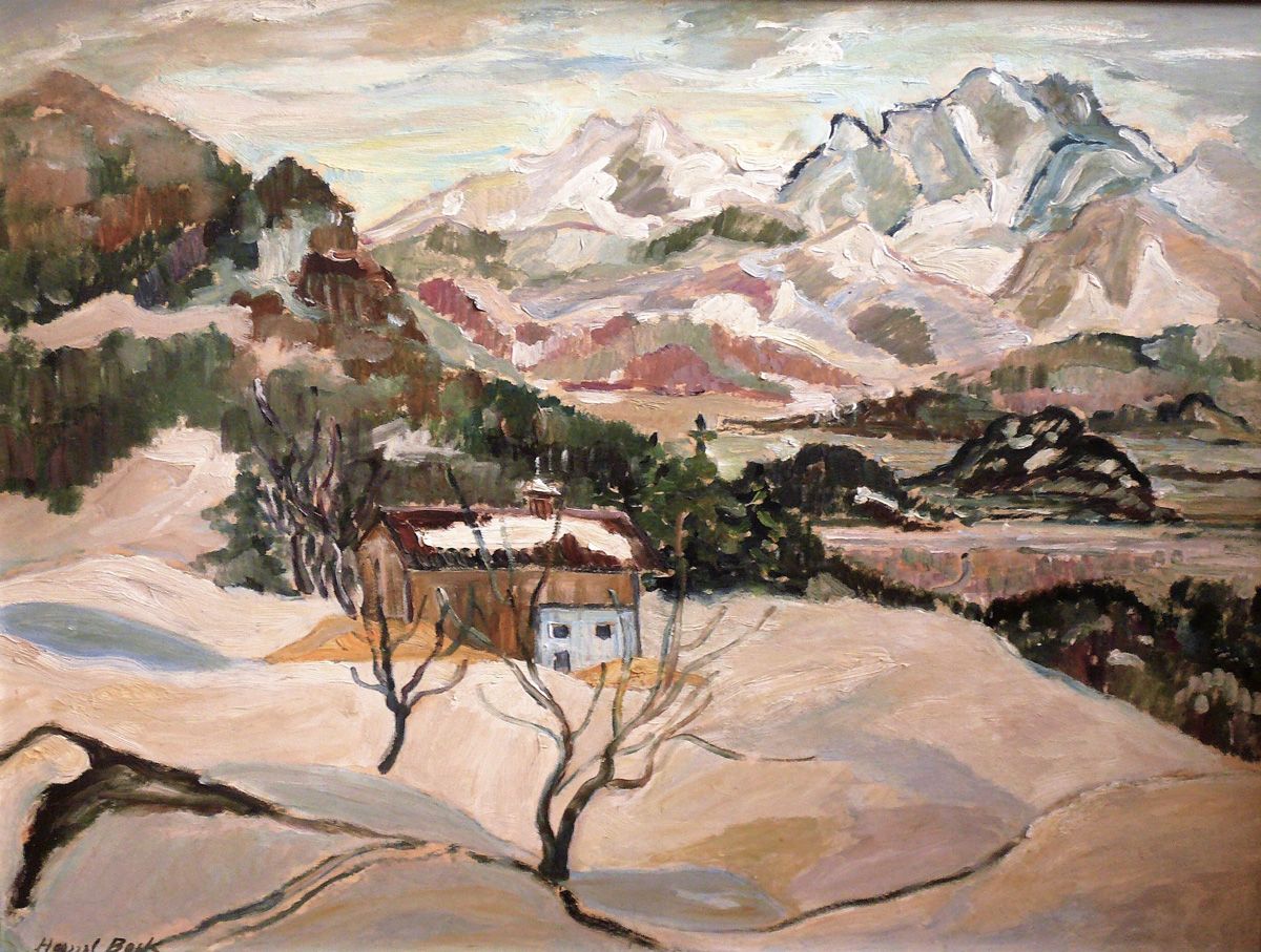Nachweislich war Hansl Bock durch die (Stief-)Eltern in Bayern viel unterwegs, vor allem am Ammersee durch den Kontakt zu Adolf Münzer. Es liegt nahe, dass sie auch weitere Ausflüge im Südbayerischen zu bestimmten, malerisch interessanten Landschaftspunkten unternommen hat, wie dieses Bild beweist. Beim Bergmassiv im Bild könnte es sich um eine Teilansicht der Kampenwand handeln (Nordseite von Aschau aus gesehen) oder um den Hochstaufen bei Bad Reichenhall.Es ist ein Winterbild mit tiefverschneiter Landschaft. Vom Vordergrund des Bildes führt ein leicht abfallender Hügel in sanfter, welliger Bewegung zum Bauerngehöft in der Bildmitte, von dort aus öffnet sich der Blick nach rechts, über eine Talsenke, hinüber zu den schneebedeckten Berggipfeln. Malerisch verschränkt Hansl Bock auf diese Weise zwei Bildebenen: Vordergrund und Hintergrund schieben sich keilförmig ineinander – ein klassisches Mittel in der Malerei um Tiefenraum zu schaffen.Die sich kreuzenden Konstruktionslinien treffen sich dabei im Bedeutungszentrum des Bildes, welches sich bei genauerem Hinsehen erschließt: fast exakt in der Bildmitte ist ein Kreuz auf einem Zwiebeltürmchen zu erkennen. An dieser Stelle befindet sich offenbar eine kleine Kapelle, verborgen im Wald, welche die Malerin subtil in das Bild rückt. Dieses religiöse Zeichen, in Verbindung mit der winterlichen Landschaft und dem einsam gelegenen Gehöft stellt das Gemälde in einen größeren ikonographischen Kontext aus Werden und Vergehen, Leben und Tod. Die Bilder von Hansl Bock sind meist gekennzeichnet durch die Abwesenheit des Menschen. Ihr Oeuvre, auch wenn es vereinzelt Darstellungen von Badenden an den Seen (v.a. Ammersee) gibt, besteht vorwiegend aus (Blumen-)Stillleben und aus Darstellungen von Landschaften, sowie Städtebildern, in denen Menschen eher selten vorkommen. Wollte man dieses Gemälde weiter interpretieren, so steht hier das von Menschenhand geschaffene Gebäude einsam der großen Weite und winterlichen Kälte der Natur gegenüber. Möglicherweise ein Spiegelbild, sowohl biographischer, wie auch zeitgeschichtlicher Begebenheiten. Bei der farbigen Gestaltung orientiert sich die Künstlerin unter anderem an den Lehren der Impressionisten: so gestaltet sie etwa die Schattenpartien farbig, in Tönen von Grau und Gelb. Auch die Berge im Hintergrund, die obere und hintere Partie des Gemäldes, wurde mit einer besonders lebhaften Farbgestaltung bedacht. Hier greift die Malerin, bei einem sehr pastosen Farbauftrag und den bereits bekannten strichelig hingesetzten Pinselstrichen, zu feinen Nuancen von Grün und Rosa-Tönen.Versucht man das Bild zeitlich einzuordnen, dann könnte das ein Hinweis sein. Denn sowohl die Malweise, wie auch der farbige Gesamteindruck dieser Landschaft entspricht der Palette, welche Hansl Bock bereits in ihrem Passau-Bild aus dem Jahre 1930 verwendete – möglicherweise stammt dieses Bild auch aus jener Zeit.Text: Dr. Ulrike Reinert