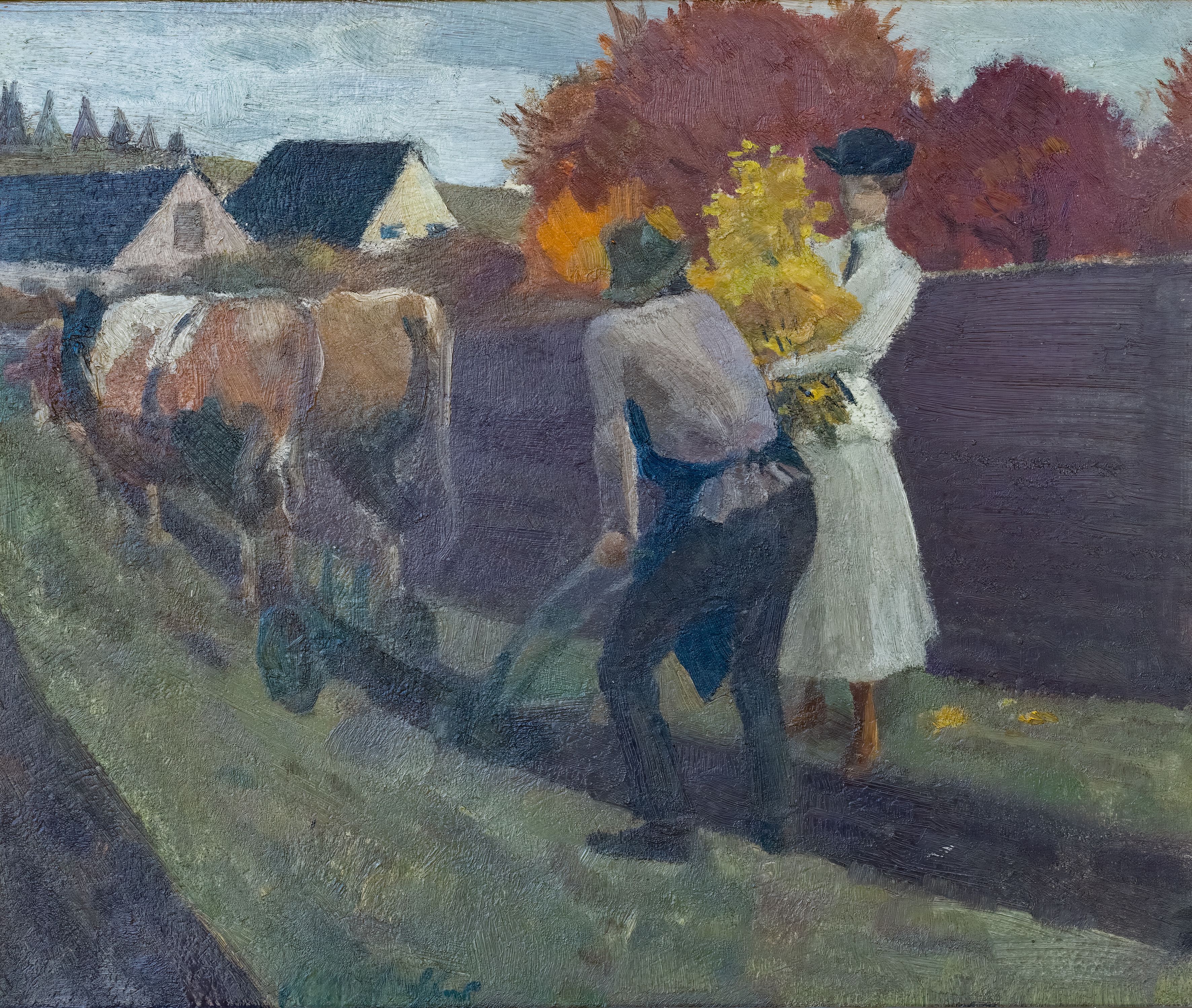 Reinhold Max Eichler, Ackernder Bauer mit Städterin, o. J., Öl auf Pappe, 24 x 29 cm, Privatbesitz, © Stephan Wagner