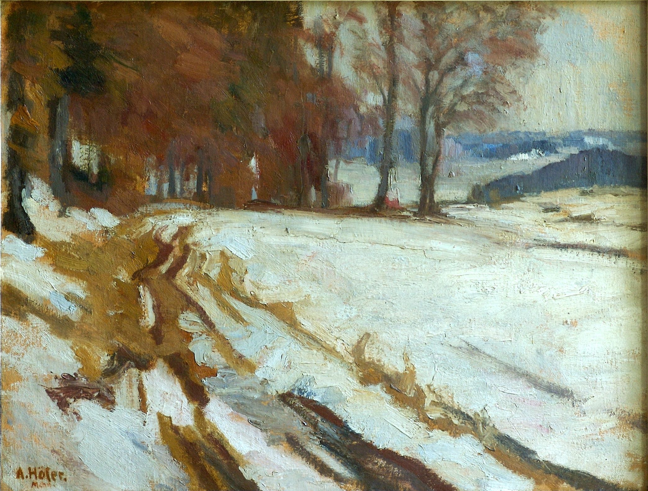 Im Zuge des Realismus und der Plein Air Malerei geriet das Thema der Jahreszeiten erneut in den Fokus der Maler und entwickelte sich zu einem autonomen Sujet. Die Jahreszeitenmotive zu Beginn des 20. Jahrhunderts stehen natürlich nicht mehr in der Tradition der „Monatsbilder“ am Beginn der Neuzeit. Sie sind auch keine Vanitassymbole oder Allegorien auf Leben und Vergehen, wie in der niederländischen Landschaftsmalerei des Barock, sondern zeigen als real beobachteter Zustand die Natur und besondere Lichtstimmungen.Besonders schneebedeckte Felder und das Variieren der Weißtöne bzw. das Spiel von Licht und Schatten auf einer Schneefläche üben eine besondere Faszination aus. Ähnlich wie der weiße Stoff eines Kleides oder eines Tischtuchs unter Bäumen spiegelt der Schnee die farbigen Reflexe der Umgebung.Höfer steht mit diesen Motiven in einer Traditionslinie, die von den französischen Impressionisten wie Monet, Camille Pissarro oder Alfred Sisley über den deutschen Maler Max Liebermann bis hin zu den „Scholle“-Kollegen Gustav Bechler oder Erich Erler-Samaden reicht.Der Weg, der in einem leichten Bogen vom unteren Bildrand zu einer Baumgruppe am rechten oberen Bildbereich führt, begrenzt das weiße Feld auf der rechten Bildseite. Hier ist der Schnee schon etwas angetaut und bräunlichem Matsch gewichen.Die Bäume im Mittelgrund trennen Vorder- und Hintergrund ab und verstellen teils den Blick auf die blauen Berge in der Ferne.Höfers Malweise ist pastos, sein Pinselstrich ist im vorderen Bildteil breiter, was das Spiel mit Ferne und Nähe betont.Text: Regina M. Fischer